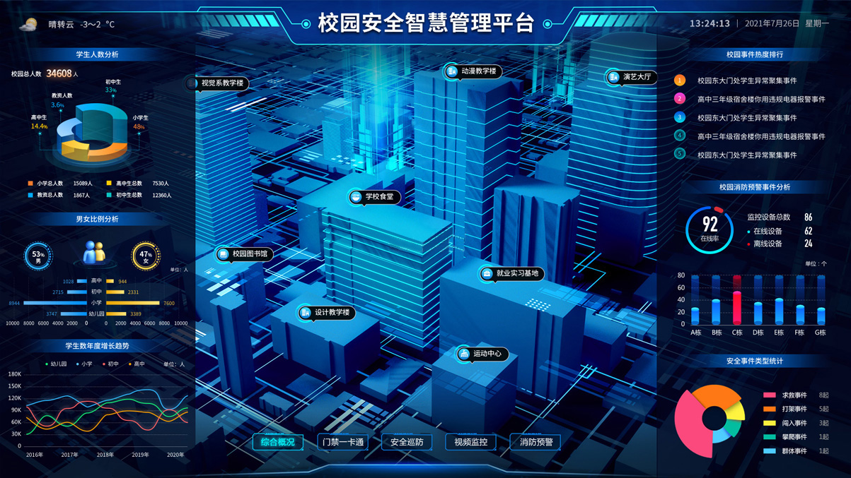全方位立體式還原院區實貌,分圖層對院區的區域、建筑、單位、安防設備、管理設備、警情等進行查看、監控和跟蹤;通過院區各類安防管理設備實時獲取各重點監控區域的監控數據,對各種突發事件進行報警。通過人臉識別、車牌識別、行為識別、武器管理、營區設備等各類傳感器,對人、車、物及其行為的全面感知,保障營區安全。 -