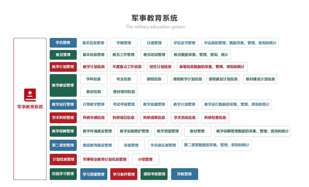 包括訓練計劃、訓練檢查、訓練考核、訓練檔案、訓練資源模塊,實現對訓練計劃制定情況自動統計和智能分析、逐步解決訓練時間、訓練人員落實情況、實現智能報靶和體能訓練監測、實現網上模擬訓練與考核的智能化、自動化和便捷化,對訓練資源科學管理,確保為軍事訓練工作有力支撐。
